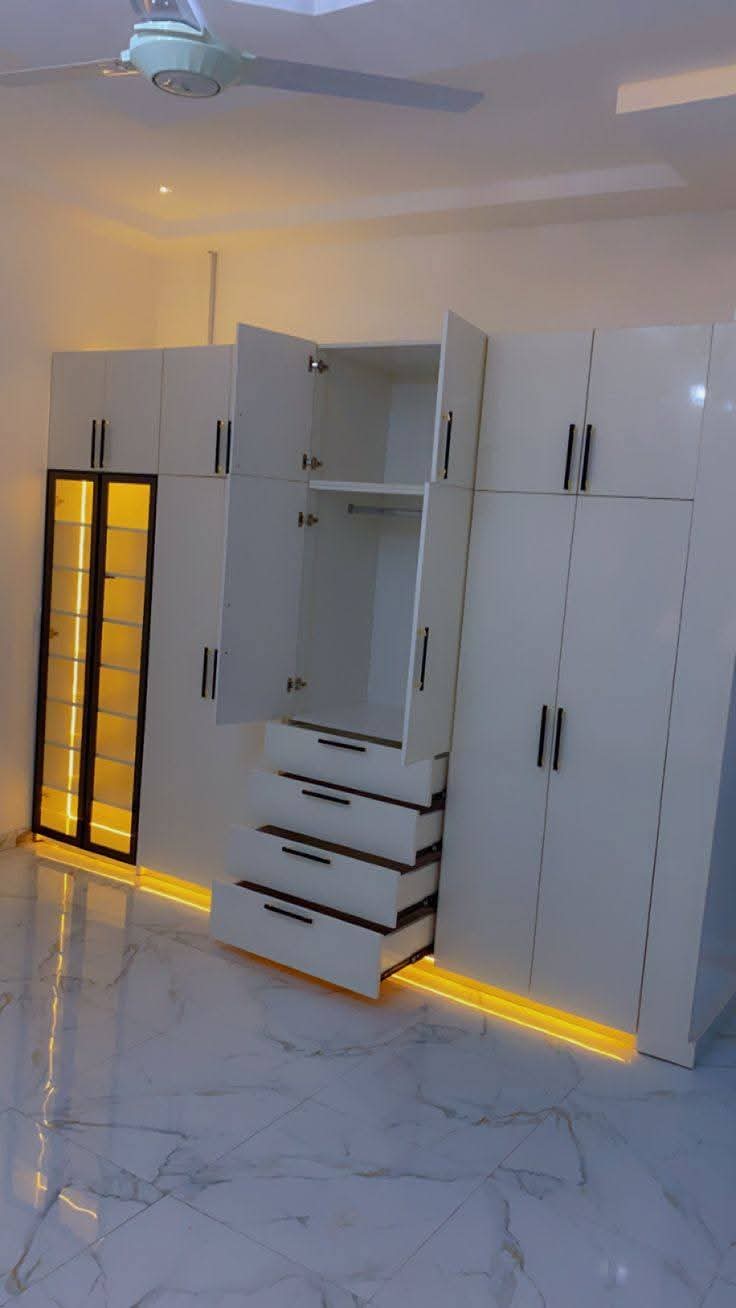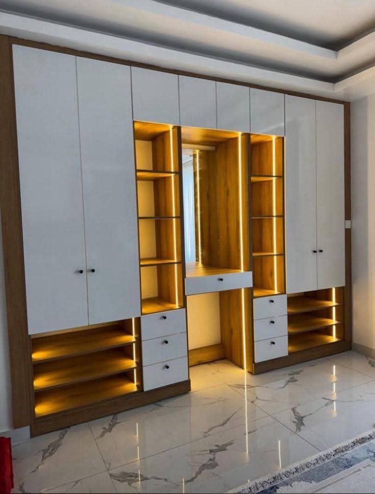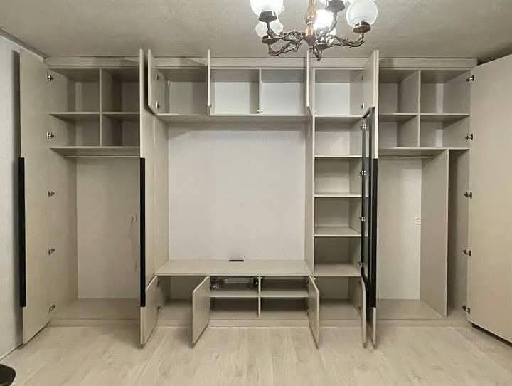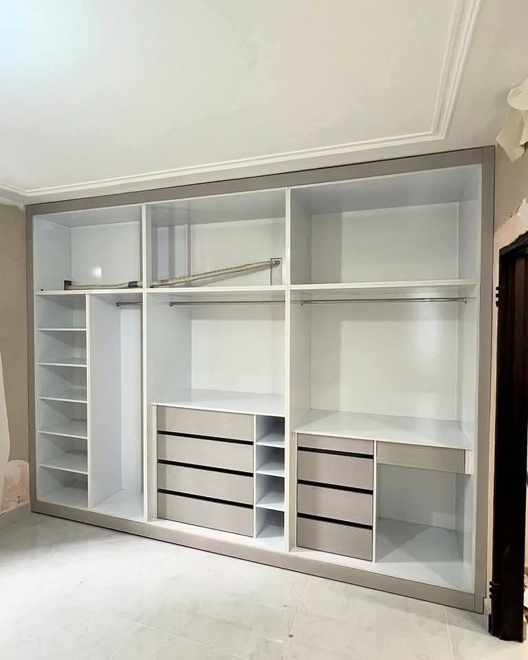 We build wardrobe closets that suit the proportions of the room and the needs of the user. Internal planning is as important as the outer look, so we balance hanging space, folded storage, drawers, and higher storage for less frequently used items.